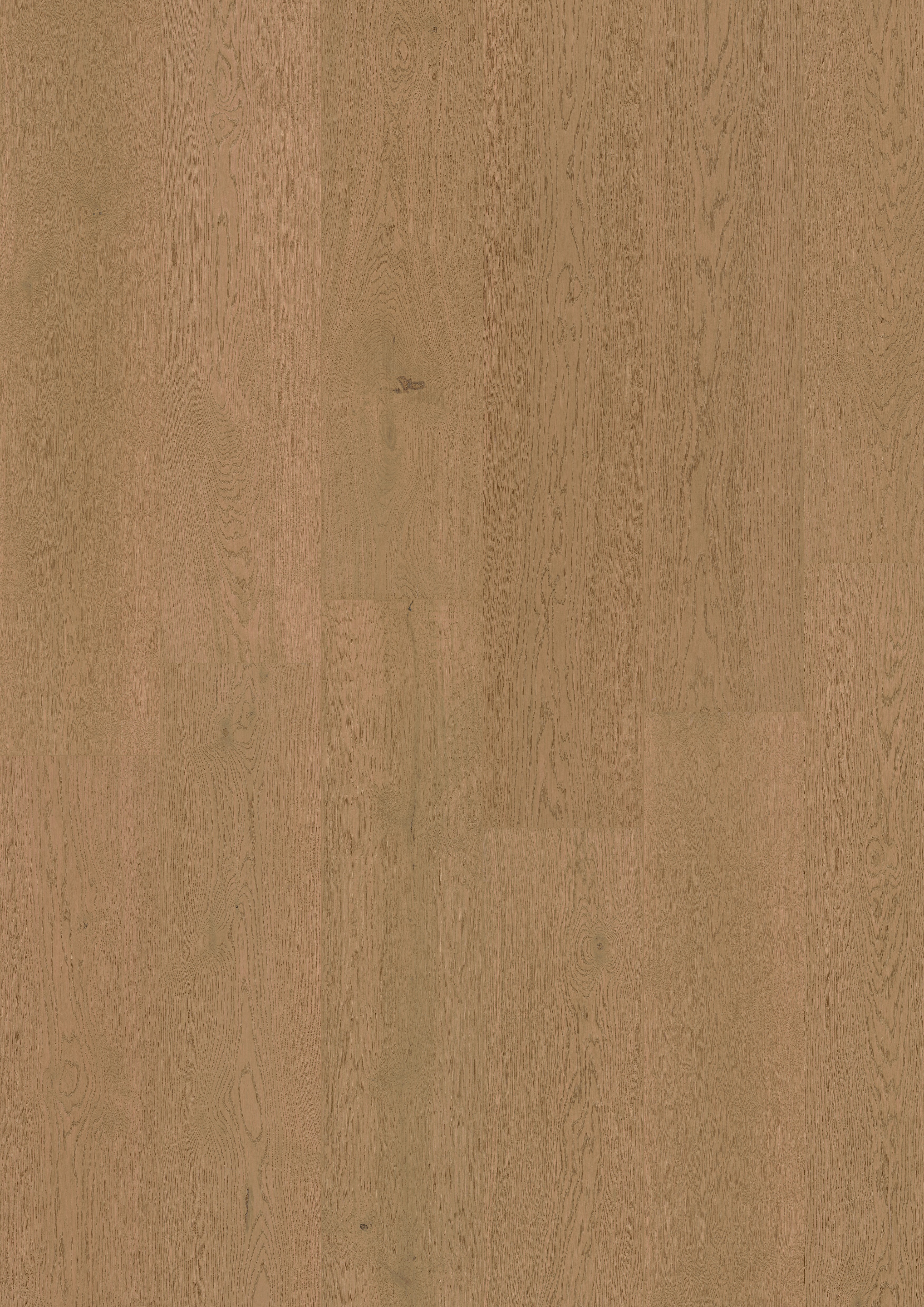 Een levendige eiken vloer met een warme leembruin tint. De natuurlijke variatie in het hout geeft karakter, terwijl de ultramat lak zorgt voor een sterke en matte afwerking.