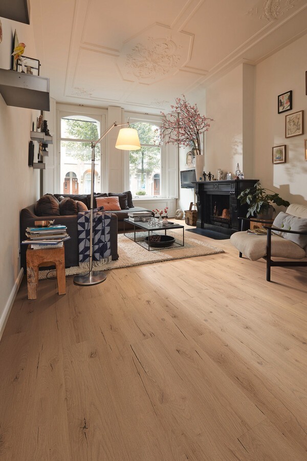Lichte eik met een stoere, gebarsten structuur die karakter en authenticiteit toevoegt.