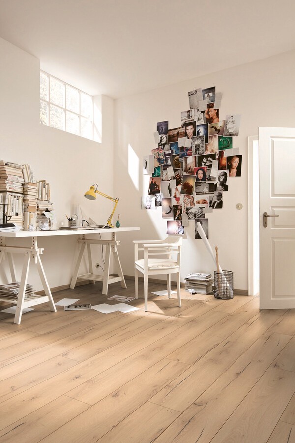 Licht eiken decor met een stoere, gebarsten look. Ideaal voor een modern industrieel interieur. De multiclic verbinding zorgt voor snelle en stevige plaatsing.