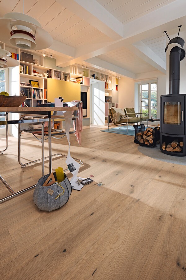 Lichte eiken kleur met een natuurlijke, zachte uitstraling. Dankzij de antistatische decorpapier is deze vloer ook praktisch in gebruik.