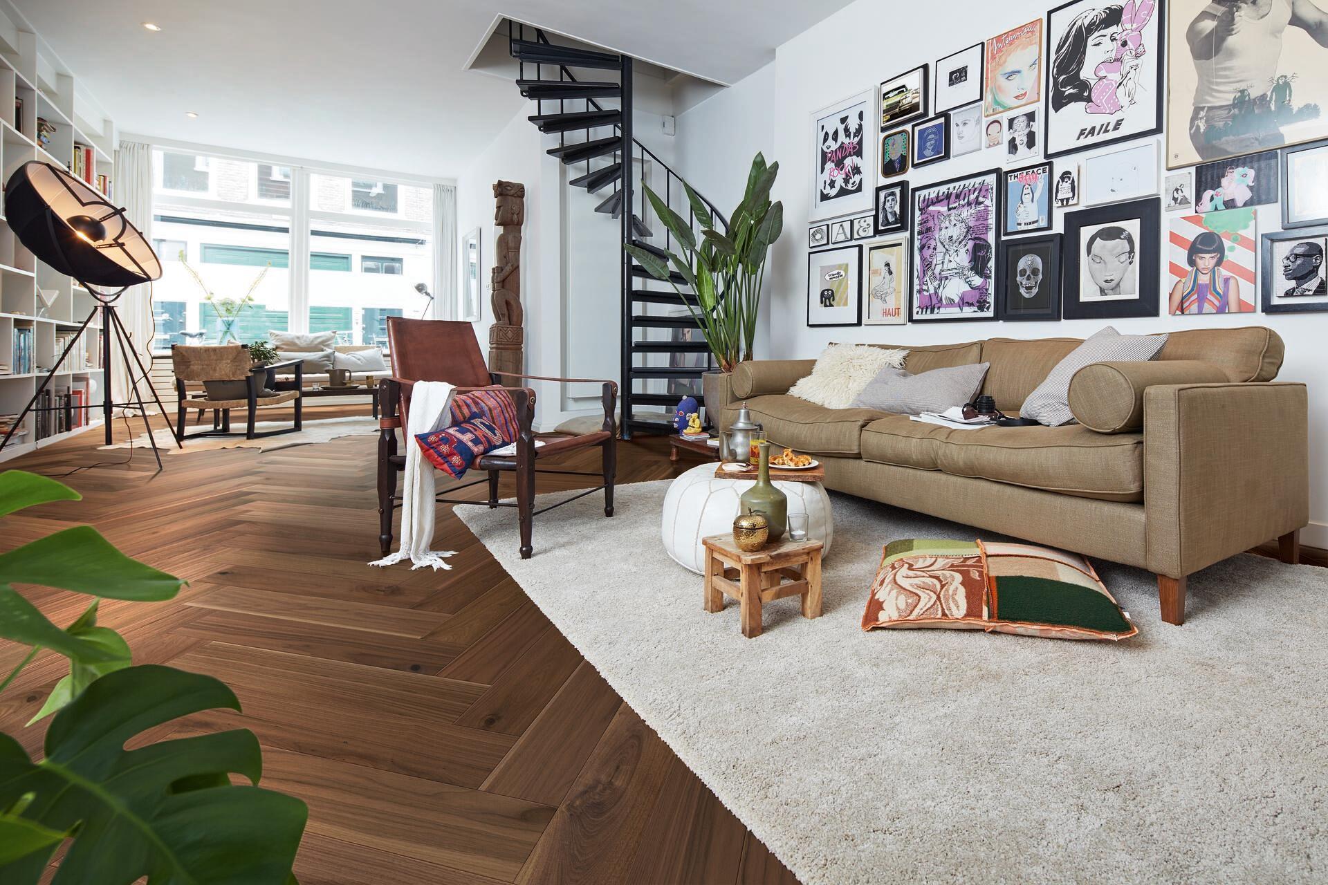 Levendige notelaar visgraat met karaktervolle details en een ultramatte finish.