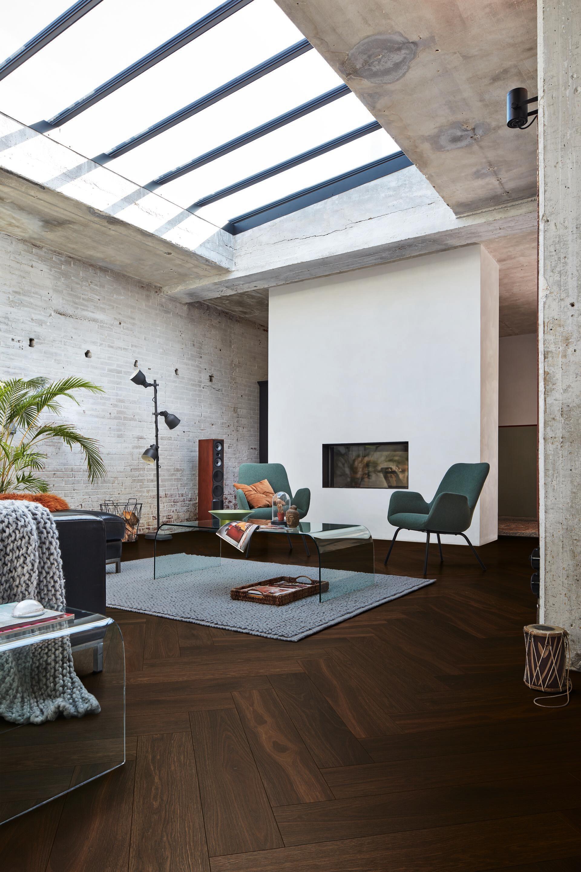 Donkere, gerookte eiken visgraat met een zachte matte lak voor een warme sfeer.
