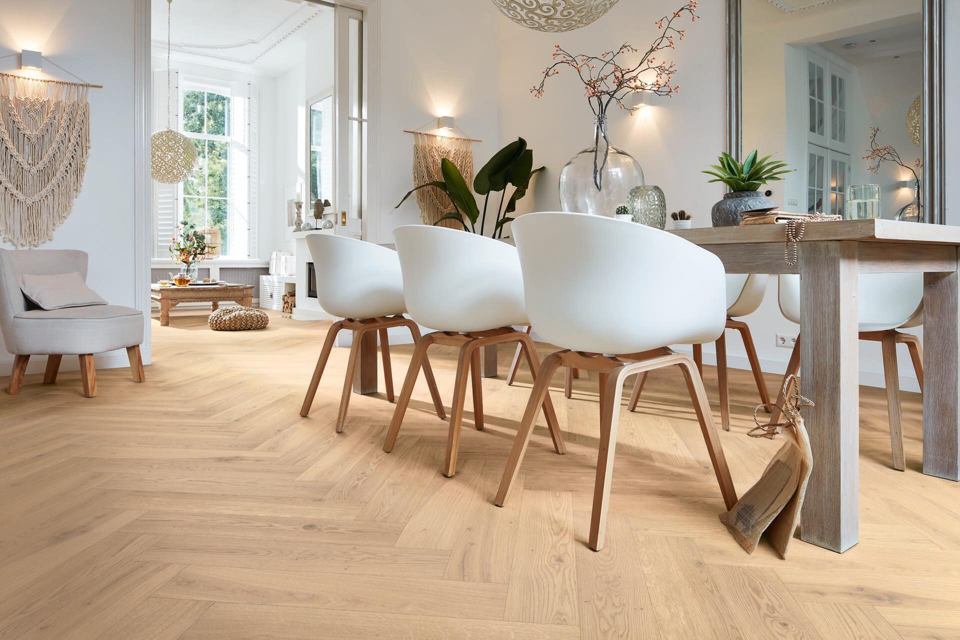 Frisse crèmewitte visgraatvloer met een matte afwerking die de houtnerven benadrukt.